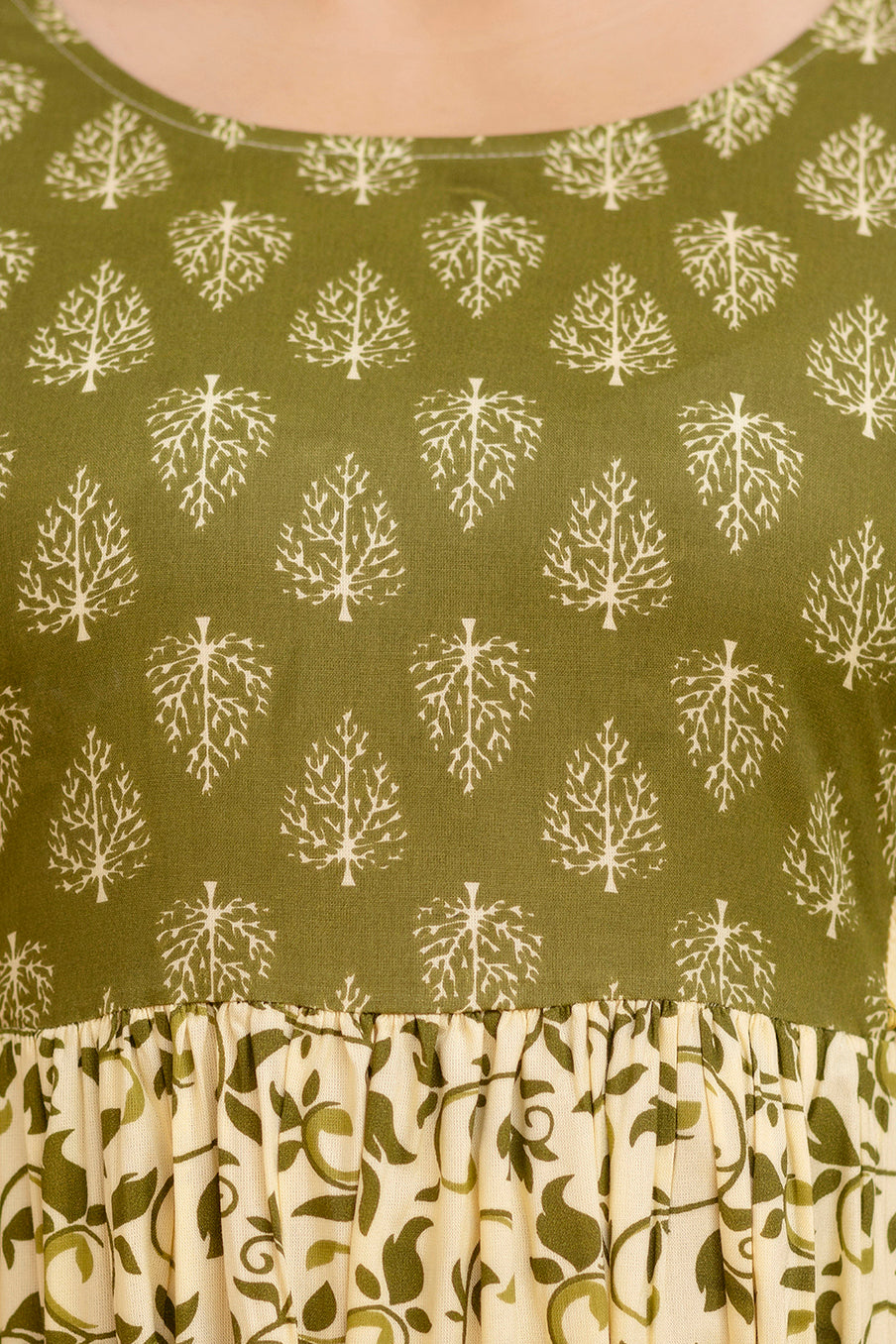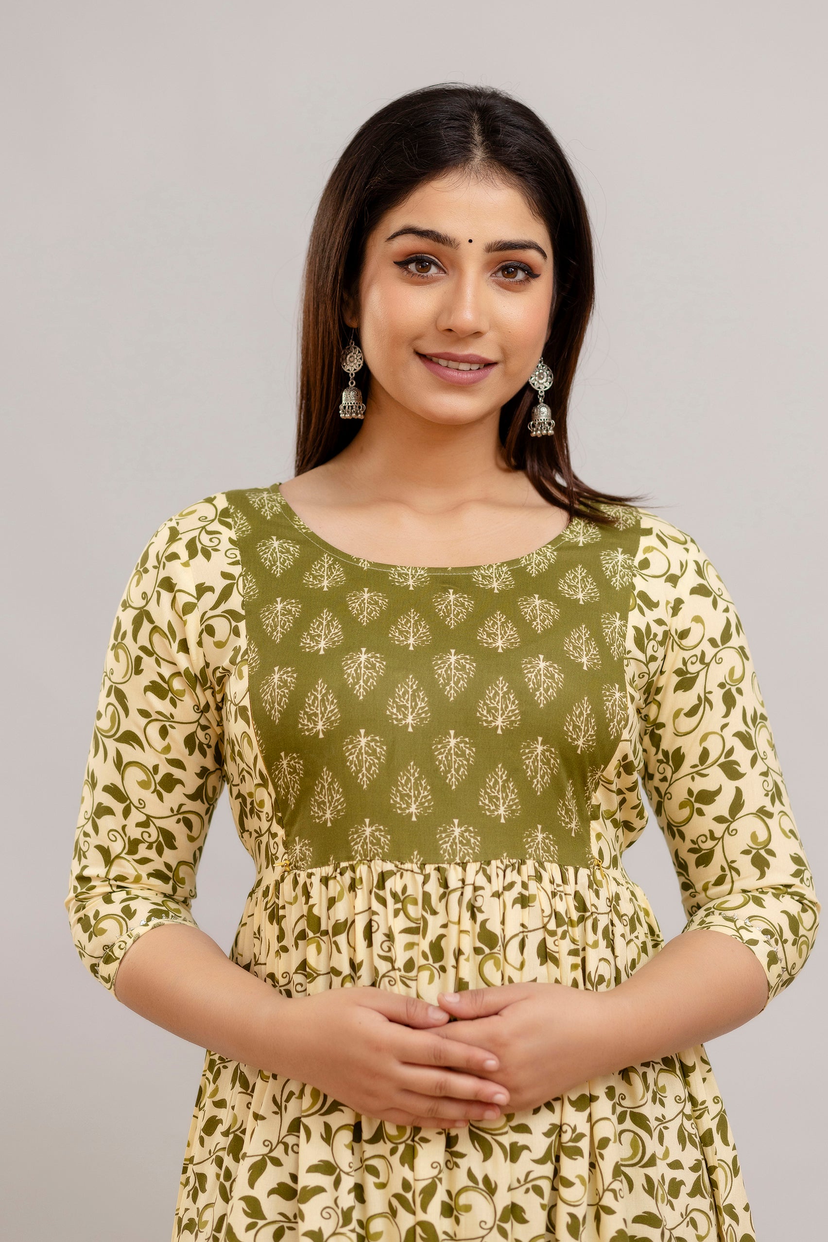 Soft, soothing, and beautifully elegant — this cream printed reyon maternity gown brings together comfort and charm in the most effortless way. The gentle cream base paired with a stylish contrast olive-green yoke creates a graceful and refreshing look perfect for every mom-to-be.