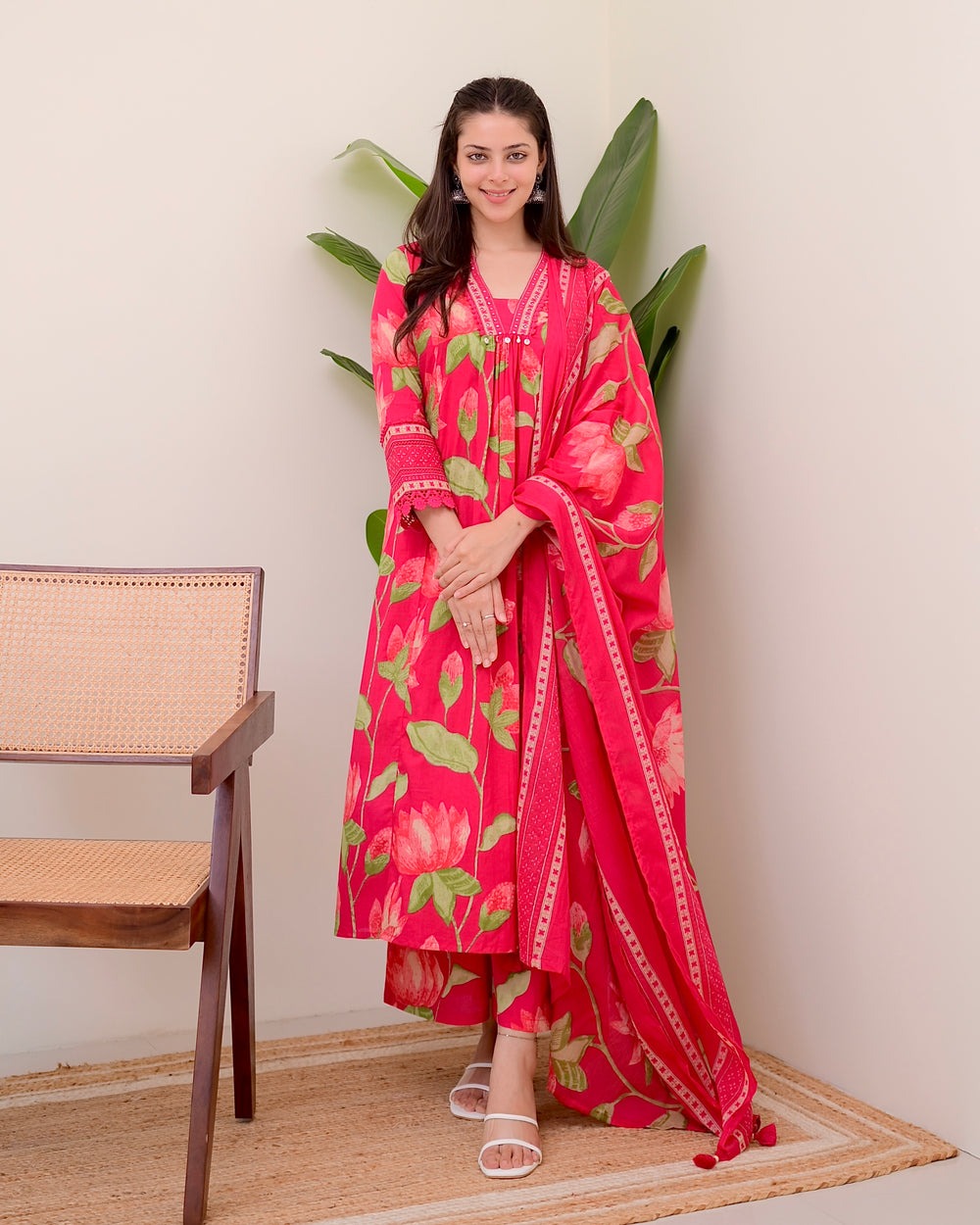 Bright, graceful, and effortlessly refreshing — this pink floral printed suit brings a perfect blend of femininity and charm. The vibrant pink base glows beautifully, while the large floral patterns add a touch of nature-inspired elegance. Crafted to fall softly and comfortably, the suit creates a breezy, flattering silhouette that enhances both confidence and comfort. Paired with a matching printed dupatta, the outfit carries a refined ethnic appeal, making it ideal for festive moments, daywear, and special gatherings.