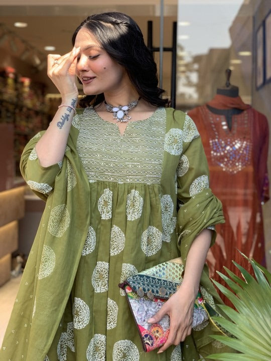 Fresh, graceful, and effortlessly elegant — this green printed suit is the perfect blend of tradition and contemporary charm. The soothing olive-green base gives the outfit a calm, earthy aura, while the white circular motifs add an artistic and hand-crafted vibrance. The intricately patterned yoke enhances the neckline and brings a refined structure to the flared silhouette. Paired with matching straight pants and a beautifully coordinated printed dupatta, this ensemble flows with comfort and sophistication. Ideal for festive wear, family gatherings, and stylish daytime outings, it offers a look that is both refreshing and timeless.